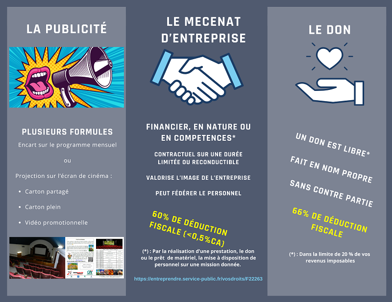 Comme tout don aux associations, votre don vous donnera droit si vous êtes imposable à une réduction d'impôts de 66% du montant de celui-ci (dans la limite de 2 000 €). Ainsi un don de 100€ ne vous coûtera que 34 €, et vous permettra de dire que si la culture reste présente à Tournon St Martin
